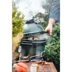 Das Big Green Egg Medium ist kompakt genug für kleine Stadtgärten, Terrassen oder Balkone, aber auch groß genug zum Grillen, Räuchern, Garen oder Backen von leckeren Gerichten für sechs bis acht Personen. Mit dem Medium im Garten kann man sich regelmäßig Freunde und Familie einladen, damit man in geselliger Runde genießen kann. Nicht zuletzt deshalb gehört dieses EGG zu den beliebtesten Modellen. Mit dem passenden convEGGtor und dem Back- und Pizzastein (nicht im Lieferumfang enthalten) verwandelt man das Big Green Egg Medium im Handumdrehen in einen Pizzaofen, der die Gäste mit den leckersten, hausgemachten Pizzen verwöhnen wird. Dieses EGG heißt zwar Medium, aber es ist alles andere als mittelmäßig. Das Geheimnis des Eggs besteht in der Kombination mehrerer Elemente. Die Keramik reflektiert die Hitze, so dass ein Luftstrom entsteht, der die Zutaten und Gerichte noch zarter macht. Die perfekte Luftzirkulation lässt die Zutaten auf der gewünschten Temperatur gleichmäßig garen. Die Temperatur lässt sich ganz genau regulieren und halten. Dank der hochwertigen, wärmeisolierenden Keramik haben auch die Außentemperaturen keinen Einfluss auf die Temperatur im Egg. Die Keramik ist außen mit einer doppelten Schutzglasur beschichtet. Da das Big Green Egg einen Temperaturbereich von 70°C bis 350°C hat, ist es für eine Vielzahl von Kochtechniken geeignet: zum Grillen, Backen, Kochen, Garen, Räuchern und für Slow Cooking.Art.-Nr.: 1595930