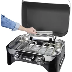 Der Campingaz Tischgrill Attitude 2100 EX verbindet eleganten urbanen Style mit professionellem Grillen, und hat dabei kompakte und transportable Maße. Die Zündung des Attitude Grills funktioniert bequem mit nur einem Knopfdruck. Der Grill bietet mit der Even Heat Technologie und dem langlebigen Blue Flame Brennersystem eine gleichmäßige Wärmeverteilung über die gesamte Grillfläche. Die doppelte digitale Temperaturanzeige misst die Wärme auf jeder Seite der Kochfläche und ermöglicht dadurch ein perfektes und vor allem präzises Wärmemanagement. Die auf dem Display angezeigten Temperaturen steigen in Schritten von 5 Grad an. Unter dem eleganten Deckel verbirgt sich ein geteilter Grillrost mit Culinary Modular Einsatz, der vielseitige Grillmöglichkeiten bietet. Die verschiedenen Einsätze für das Culinary Modular System bringen das urbane Grillen auf das nächste Level, indem man einfach den inneren Ring des gusseisernen Grillrostes herausnimmt und ein Culinary Modular Zubehörteil, wie z.B. Pizzastein Bratpfanne, Plancha oder Paellapfanne (separat erhältlich) hineinlegt. Mit dem Culinary Modular Zubehör kann man seiner Kreativität von Pizza bis Paella frei entfalten. Mit dem patentierten Campingaz InstaClean System war die Reinigung nach dem Grillen noch nie so einfach. Der Attitude 2100 EX verfügt über eine frontseitige Fettauffangschale und ermöglicht es, die verchromten, spülmaschinengeeigneten Teile in weniger als 60 Sekunden schnell, einfach und sauber zu entnehmen.Art.-Nr.: 1657945