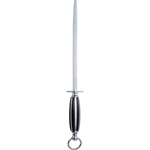 Im Jahr 1905 hat F. Dick eine Kochmesserserie mit massiven Zwingen entwickelt, diese ersetzten die bisher üblichen Nieten. Damals wie heute besticht die Serie 1905 durch ihre außergewöhnliche Optik. Die ebenmäßigen Stahlringe werden mit einer einzigartigen Technik mit dem Kunststoff untrennbar verbunden. Teil dieser Serie ist der runde Wetzstahl mit Standardzug. Selbstverständlich besteht er aus einem der hochwertigsten deutschen Stähle. Durch den Kropf wird die führende Hand vor Verletzungen an der Schneide sicher geschützt. Mit der Serie 1905 verbinden sich traditionelles Design und moderne Technologie. Die außergewöhnliche Optik der Serie 1905 verbindet sich selbstverständlich mit den heutigen hohen Hygieneansprüchen.Art.-Nr.: 1608410