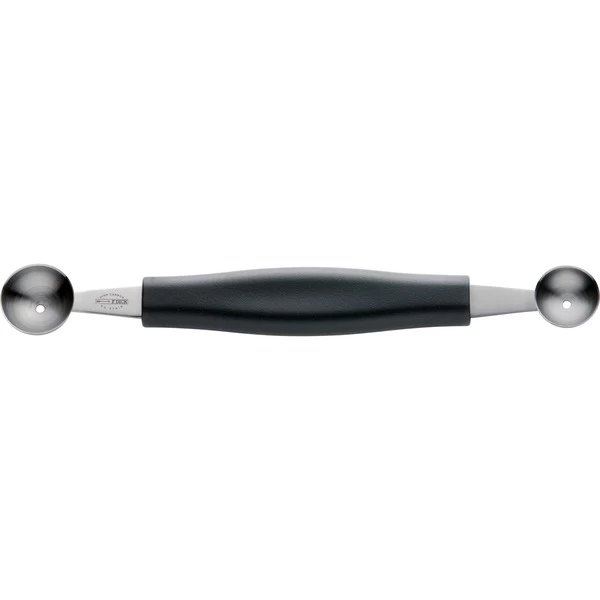 Mit dem doppelten Fruchtausstecher von DICK (auch als Kugelausstecher oder Pariser Löffel bezeichnet) kann man Kugeln aus Früchten wie z.B. Melonen ausstechen. Man kann entweder die Seite mit 22mm oder mit 25mm verwenden, entsprechend groß werden dann die Kugeln. Der schwarze Kunststoffgriff liegt dabei angenehm und sicher in der Hand. Kleinere Obst- und Gemüsesorten, oder Paprika- und Chilischoten können mit diesem Fruchtausstecher auch entkernt werden.Art.-Nr.: 1619957