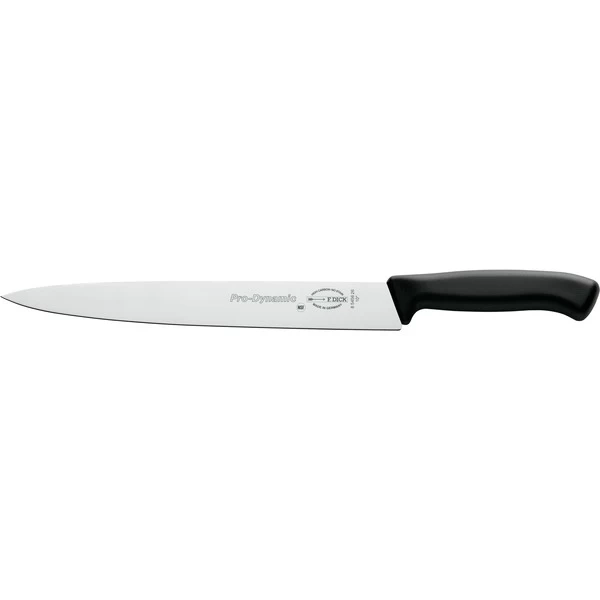Die glatte Schneide und die dünne Klinge des ProDynamic Tranchiermessers von DICK schneidet problemlos rohes Fleisch, Braten, Roastbeef oder Schinken in perfekte, dünne Scheiben und reduziert das Auslaufen von wertvollem Bratensaft. Die Messer der Serie ProDynamic finden in der Gastronomie, in Großküchen und im Thekenbereich ihren Einsatz. Sie zeichnen sich durch ein geringes Gewicht aus und ermöglichen ein längeres ermüdungsfreies Arbeiten. Der ergonomisch geformte Vollkunststoffgriff und die Qualitätsklinge aus Edelstahl ergeben ein modernes Messer in klarem Design.Art.-Nr.: 1707835