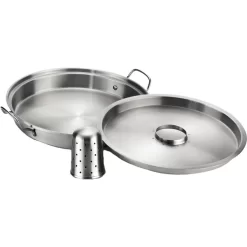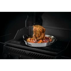 Die 3 in1 Premium Hähnchen-Halterung 56067 von Napoleon besteht aus drei einfach abzunehmenden Edelstahl-Teilen. Die Anwendung ist denkbar leicht: Flüssigkeit in die untere Pfanne gießen, den Deckel einlegen (darauf kann Gemüse gegart werden) und anschließend den Hähnchenhalter einsetzen und das Hähnchen darauf platzieren. Das durchdachte Grillwerkzeug sorgt für ein hervorragendes Aroma. Man kann auch der Kreativität freien Lauf lassen und verschiedene andere Säfte, Weine oder sonstige Flüssigkeiten ausprobieren. Die Premium Hähnchen-Halterung ist selbstverständlich spülmaschinenfest.Art.-Nr.: 1872856