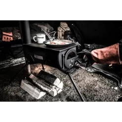 Der Campingkocher und Zeltofen Loki2 von Petromax überzeugt mit seinem ausgefeilten Design und der durchdachten Konstruktion. Über ein Feder-Stiftsystem werden die Beine ausgeklappt und sorgen für sicheren Stand. Sind die drei Standbeine eingeklappt und das fünfteilige Ofenrohr im Bauch des Ofens verstaut, bringt es der leistungsstarke Kocher auf ein kleines Packmaß. Mit etwa 12 Kilo gehört er zu den Leichtgewichten unter den Zeltöfen. Beim Camping eine leckere Mahlzeit zu kochen, ist mit dem Petromax Loki2 so einfach wie zuhause am Herd: Anheizen und Topf oder Pfanne auf die Kochfläche (40 x 25cm) stellen. Der stufenlose Luftschieber und der Glaseinsatz in der Ofentür ermöglichen eine gute Kontrolle über das Feuer. Es ist auch möglich, die runde Kochplatte aus der Kochfläche herauszunehmen und direkt über dem offenen Feuer kochen. Der Campingkocher und Zeltofen Loki2 eignet sich für verschiedene Zelttypen, wenn er um die passende Zeltdurchführung ergänzt wird. Hierfür bietet Petromax die entsprechenden Zubehörteile und auch eine Transporttasche.Art.-Nr.: 1662967