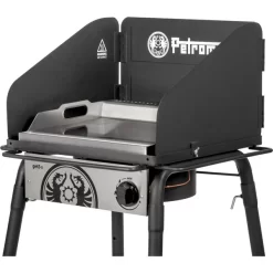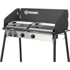 Mit der Plancha Grillplatte von Petromax erweitert man den Petromax Gastisch um eine typisch spanische Plancha-Platte mit durchdachten Details. Die Grillplatte aus Edelstahl ermöglicht dank unterschiedlicher Temperaturzonen beste Ergebnisse. Hier brutzeln deftige Fleischspezialitäten extra saftig, während zeitgleich Grillgemüse oder würzige Shrimps am Rand bei geringerer Hitze darauf warten können, serviert zu werden. Mit Hilfe der praktischen Henkel kann man die Platte einfach auf den Gastisch legen, sie passt auf alle Modelle mit Einzel- und Mehrfachbrenner. Fettarmes Grillen gehört von nun an selbstverständlich dazu, da die Auffangrinne an der vorderen Kante während des Grillens dafür sorgt, dass Fett aus den Speisen abläuft und nicht in Kontakt mit der Flamme kommt. Anders als beim Grillrost bleiben auch gefüllte Champignons, Kartoffelspalten oder Wassermelonenstücke sicher auf der Grillplatte liegen. Schlitze am oberen Teil der Grillplatte sorgen für die notwendige Belüftung und vermeiden einen Hitzestau. Nach dem Grillen kann die abgekühlte Plancha an den Tragehenkeln vom Gastisch genommen und einfach separat gereinigt werden. Als optimale Erweiterung für den Gastisch bietet die Edelstahl-Plancha alle Vorteile des spanischen Grillens für vielfältige Grill-Ergebnisse in der Campingküche.Art.-Nr.: 1881588
