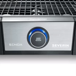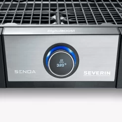 Der SEVERIN Elektro-Tischgrill SENOA DigitalBOOST für drinnen und draußen überzeugt besonders durch Leistung: 3.000 Watt und die innovative Doppelheizungs-Technologie sowie eine speziell entwickelte Reflektorschale ermöglichen eine Spitzentemperatur von von bis zu 500°C direkt am Grillgut. Die leistungsstarke Boost-Zone ist so abgeteilt, dass auch ein ZweiZonen-Grillen auf der ca. 41 x 24cm großen Grillfläche möglich ist. Das digitale OLED Display mit integriertem Timer und Kernthermometer ermöglicht eine exakte Temperatureinstellung für perfekte Ergebnisse. Ein weiteres Highlight ist die Status-LED-Beleuchtung, die zwischen Blau (Standby), Orange (bis 320°C) und Rot (BoostZone, bis 500°C) wechselt und so anzeigt, welcher Temperaturbereich auf dem Grill in Benutzung ist. Ein Sicherheits-Mikroschalter stellt das Heizelement bei Entnahme automatisch ab. Der Edelstahl-Grillrost und viele weitere Teile sind entnehmbar, wodurch eine leichte Reinigung möglich ist.Art.-Nr.: 1862303
