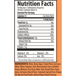 | Zutaten | Wasser, brauner Zucker, Tomatenmark, Soja Sauce (Wasser, Weizen, Sojabohnen, Salz), Worcestershire Sauce (Essig, Melasse, Maissirup, Wasser, Salz, Karamellfarbe, Zucker, Gewürze, Sardellen, natürliches Aroma, Tamarinde), Aprikosenpüree, Essig, Salz, Senfpulver, natürliches Hickory Raucharoma | ||